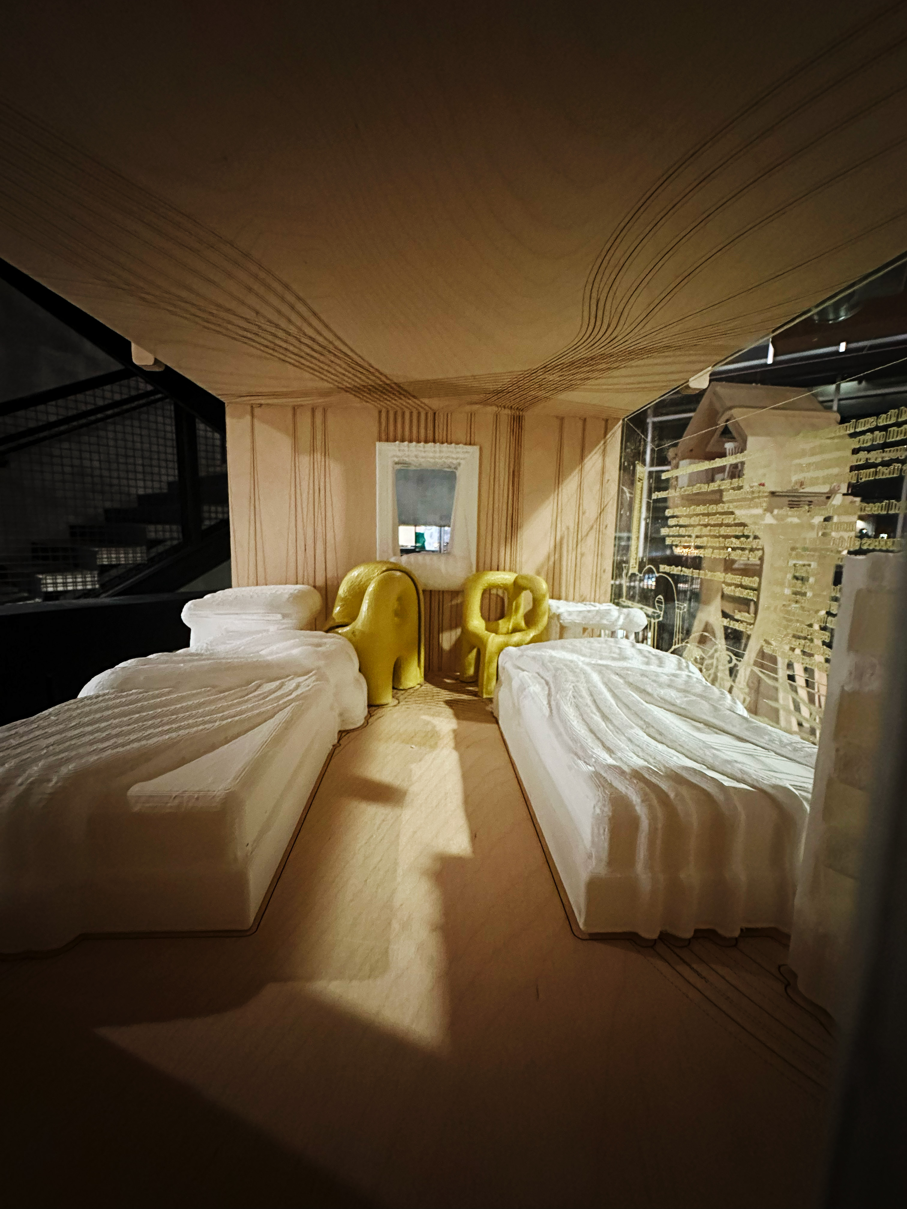 There are four intersections these bedrooms explore. The first is lamp + health. The typology is a small attic bedroom, somewhere stuffy and out of the way. The light fixture carves out the hardships of access to healthcare, in an already tedious system- access is blocked and health is affected over and over again. The lamp as an artifact that informs us of this discomfort. The second is bed + mental health. The bedroom here is a typology of a larger room with a bay window, one occupied with a partner. The bed as an artifact bursts with the discomfort of insomnia, anxiety, and access to mental