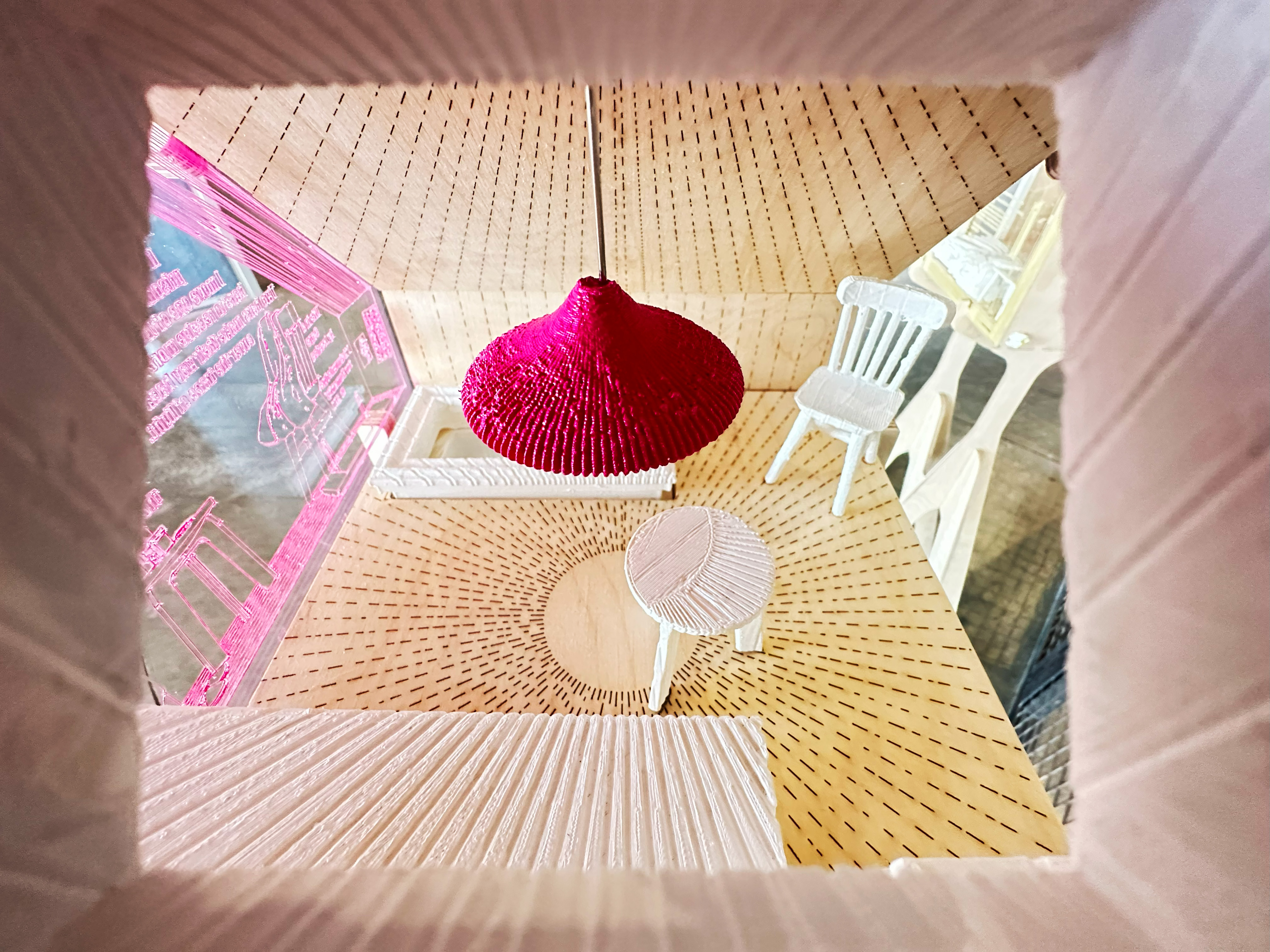 morphology emits from a given artifact and morphs the bedroom itself through carving, addition, and etching. 9” x 16” white museum board etched with laser cutter