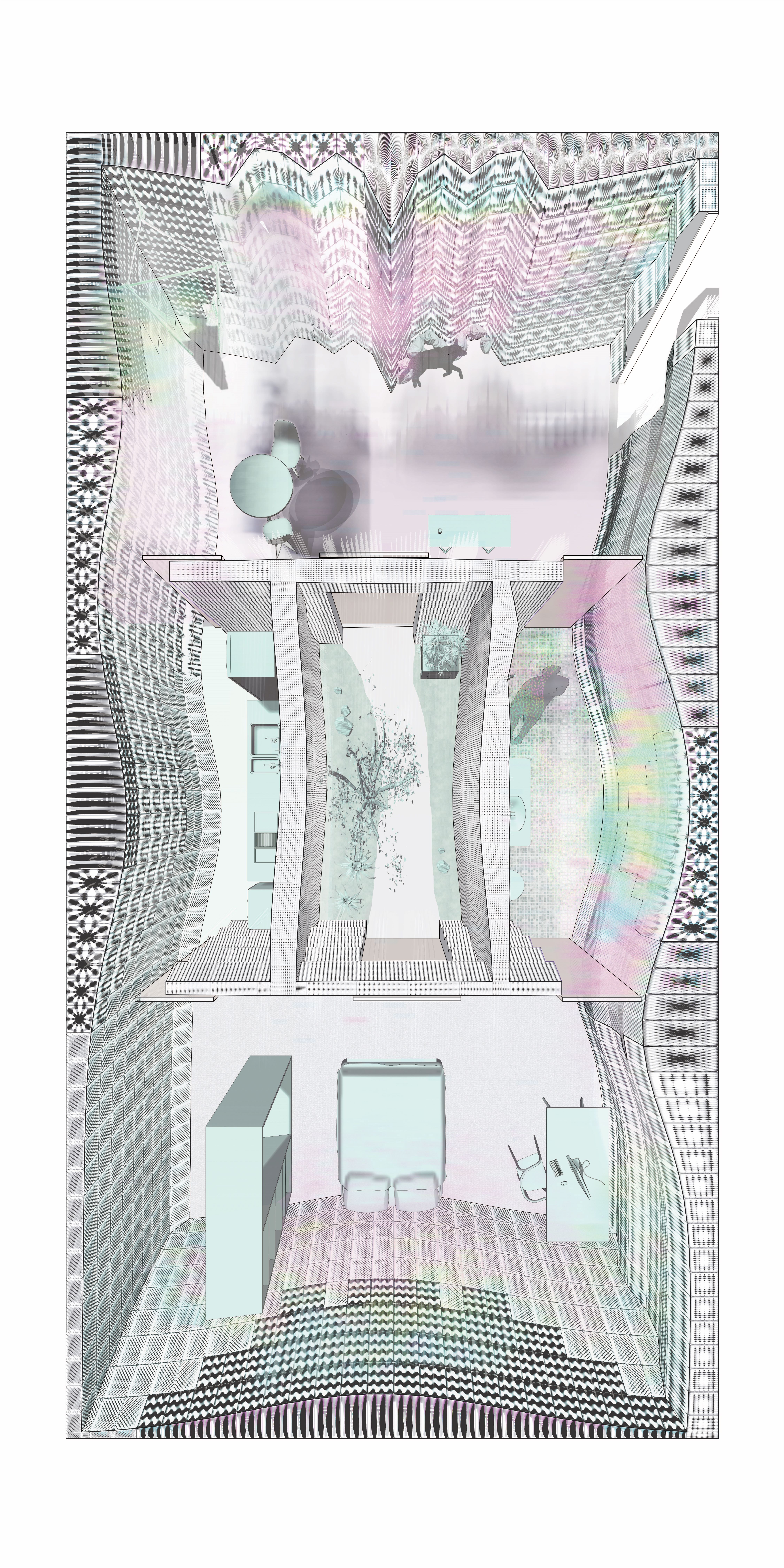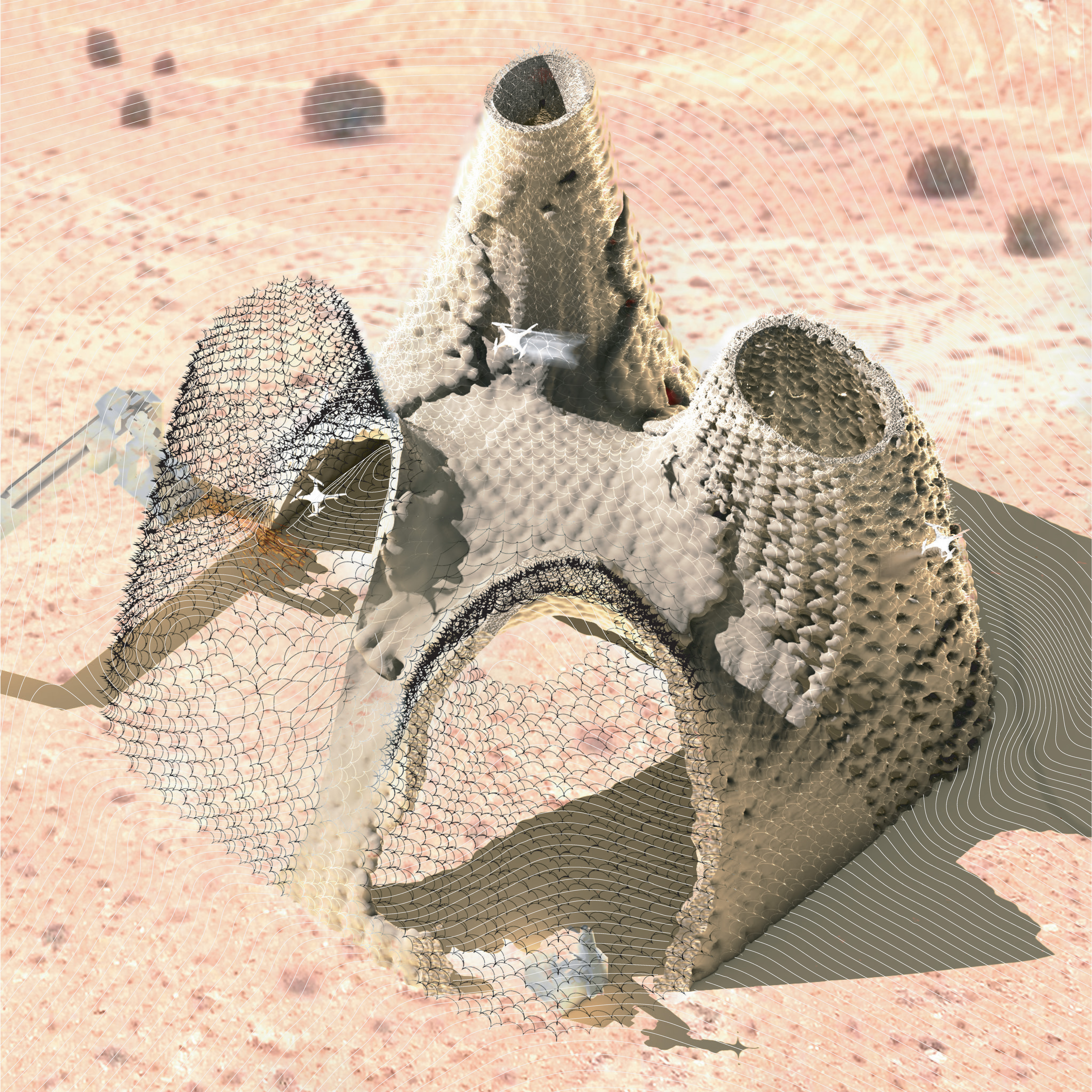 this project explores thermal domestic spaces crafted by autonomous robots—a 6-axis robotic welder and a quadrotor shotdobe robot that layer adobe into walls, creating a tactile thermal landscape. Through a new architectural language, plume and poche emerge. Plume refers to the intangible conditions felt by the body, like temperature shifts that ebb and flow within the space, while poche is the substantial thickness of adobe walls, curating warmth and coolness through layers. Together, plume and poche transform the home into a space where climate and materiality harmonize through an automated yet deeply sensorial process.